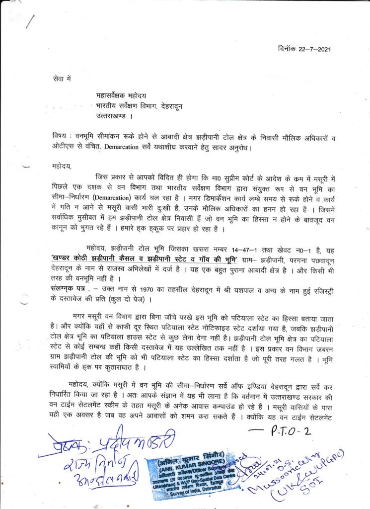 इन दिनों झड़ीपानी क्षेत्र में सर्वे का कार्य चल रहा है। पालिका रिकार्ड में इस इस्टेट का नाम किंगलाॅज के नाम से बताया जा रहा है । यह सम्पूर्ण क्षेत्र तीन इस्टेट पटियाला स्टेट, ओकग्रोव तथा किंगलाॅज इस्टेट के रूप में दर्ज है । झड़ीपानी निवासी एवं राज्य आन्दोलनकारी प्रदीप भण्डारी ने भी सर्वे विभाग तथा वन विभाग को अनेको बार मसूरी में सर्वे शीघ्र पूरा करने हेतु ज्ञापन दिए व विभागों का घेराव भी किया । तमाम जनप्रतिनिधि भी लम्बे समय से सर्वे पूरा करने की मांग उठाते रहे हैं । अंततः अब मसूरी का डि-नोटिफाइड डिमार्केशन का सर्वे कार्य पूरा होने की उम्मीद जीम है ।